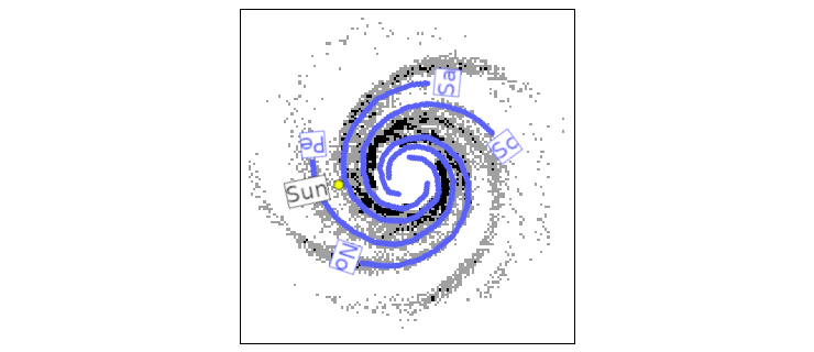 Black/gray: Spiral arms that form in our model spontanously. Blue: Observed spiral arms in the Milky Ways ISM.